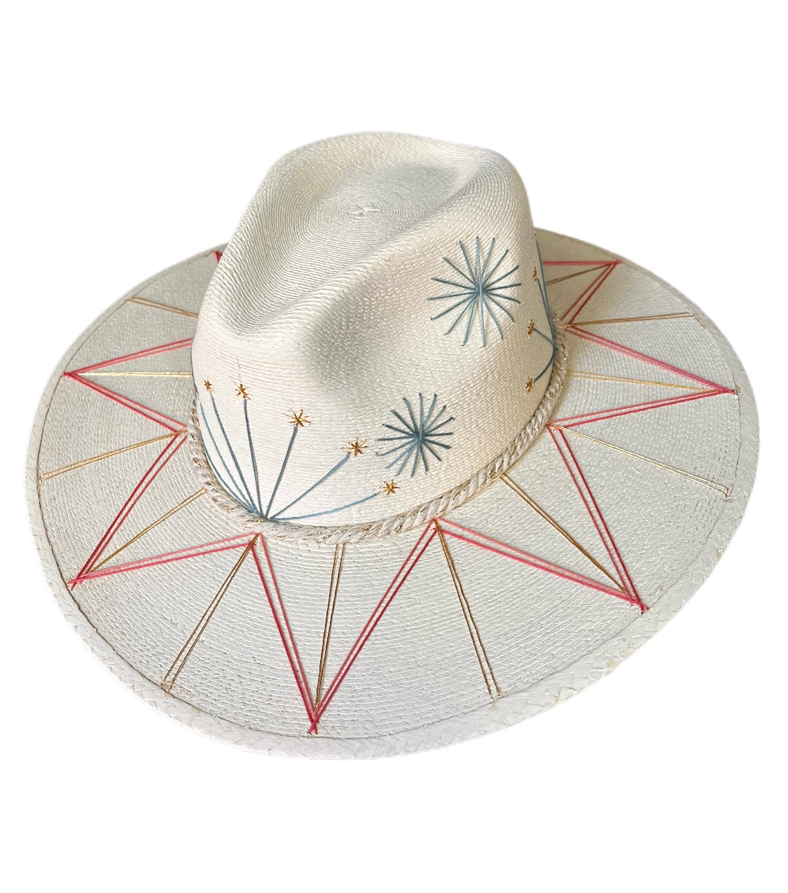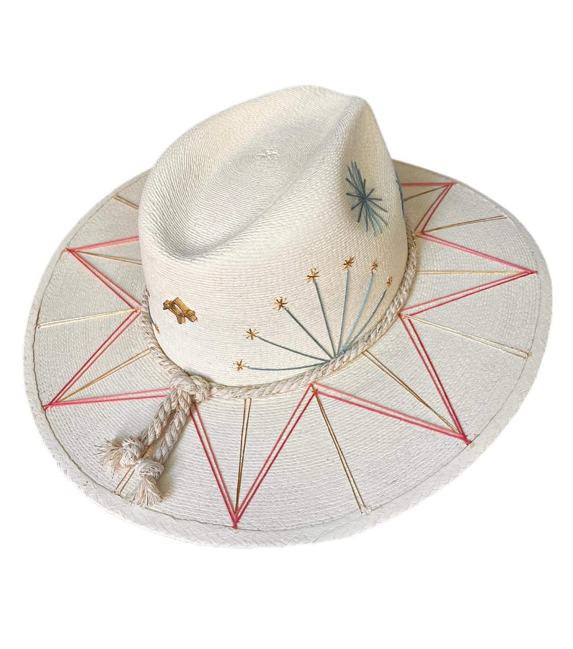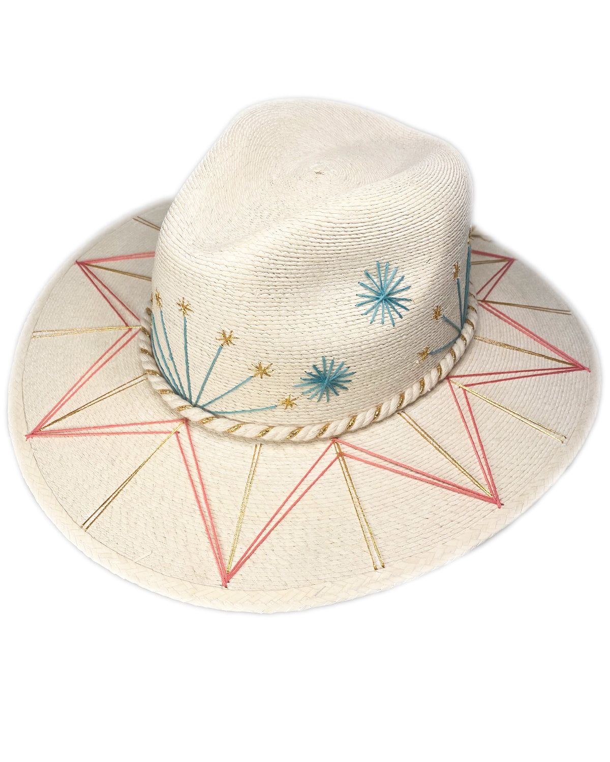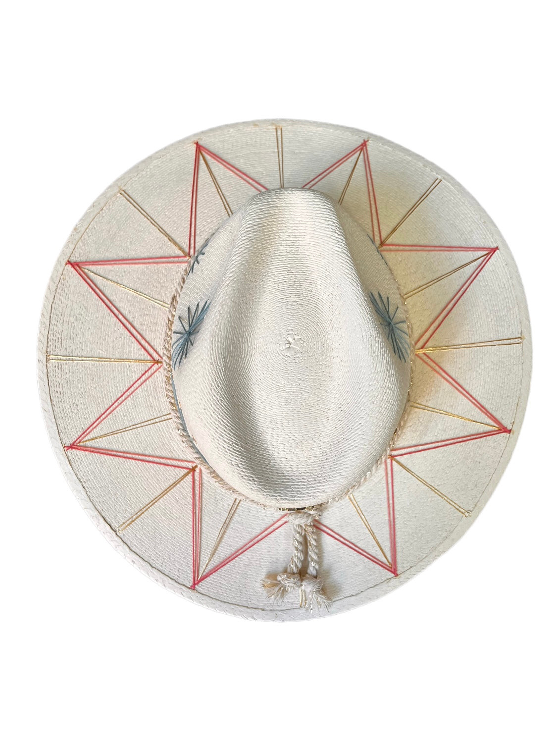 Sombrero de Palma fina y resistente bordada a mano con diseños únicos super coloridos y motivos mexicanos inspirados en la Paz Baja California, México. Talla Standard/Unitalla. El sombrero viene una placa de metal con la insignia de la marca. El diseño del patrón en los hilos multicolor es igual al de la imagen y en los hilos puede variar algún tono.